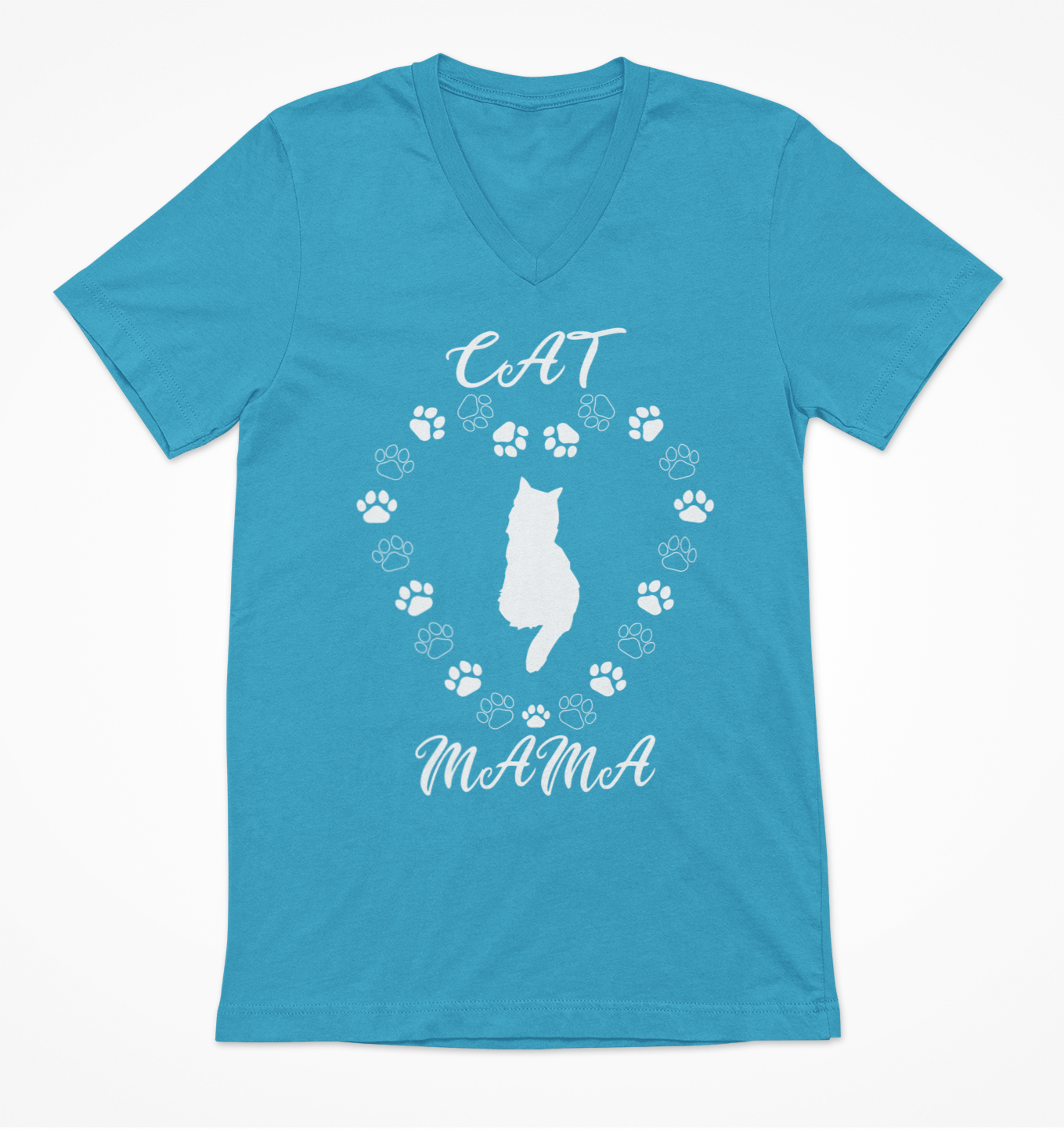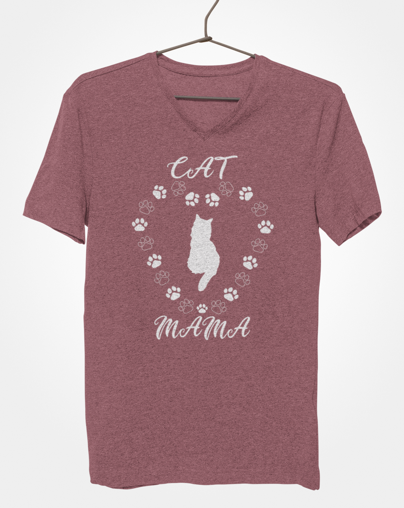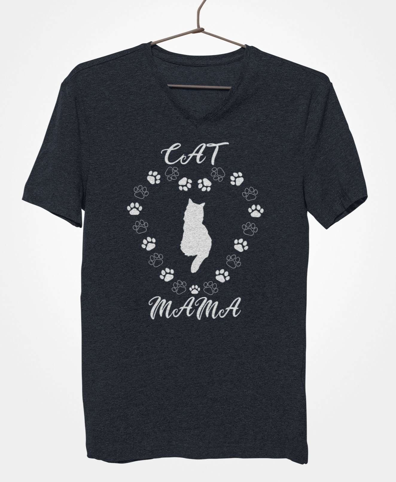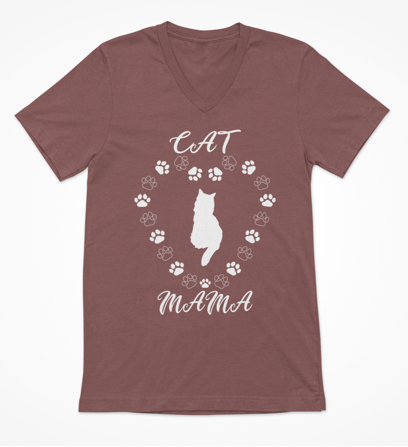 Cat Mama in white text and graphics women's v-neck t-shirt.