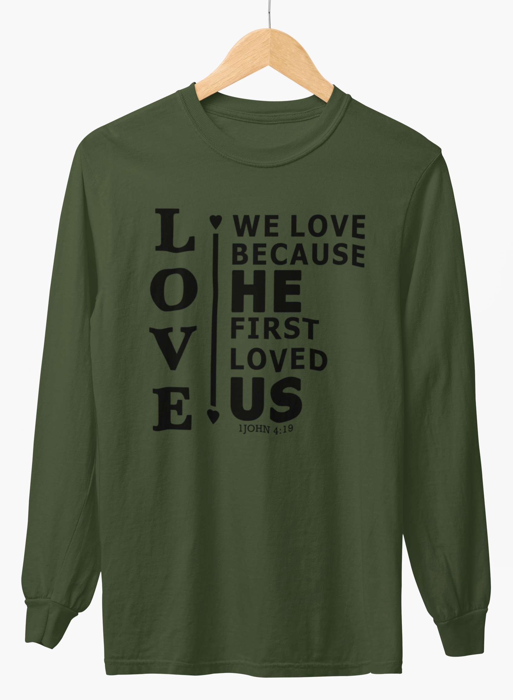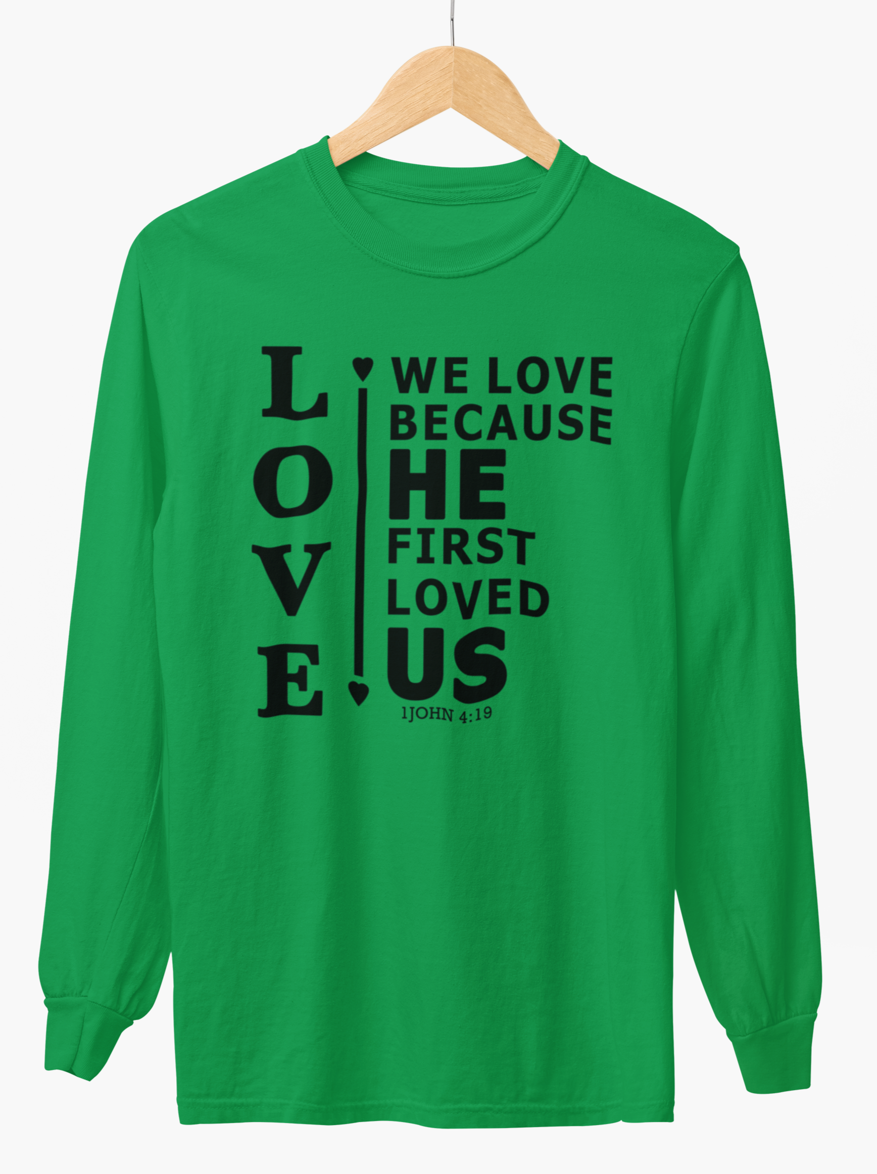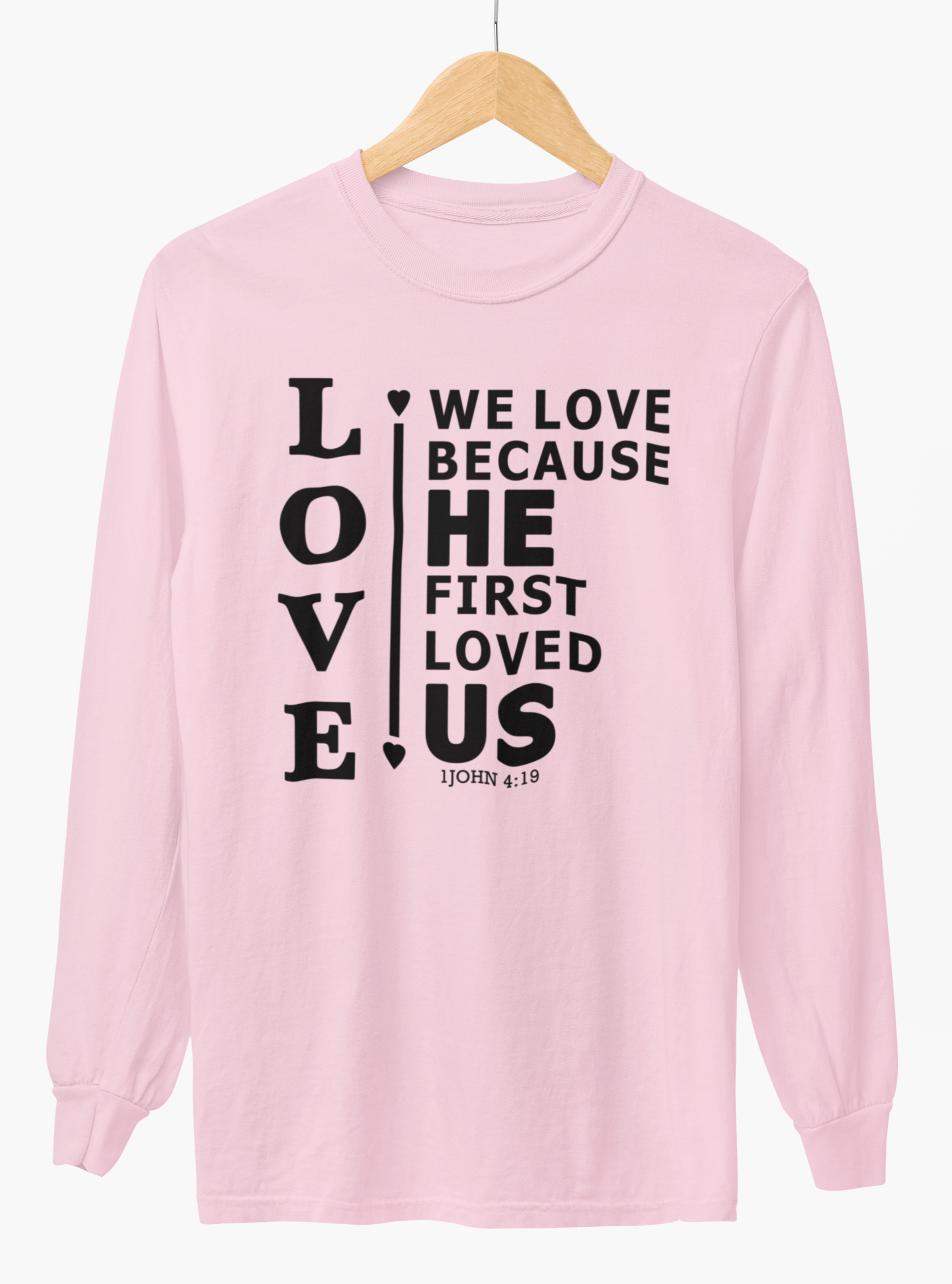 "We Love Because He First Loved Us" from the scripture verse 1 John 4:19, long-sleeve t-shirt.